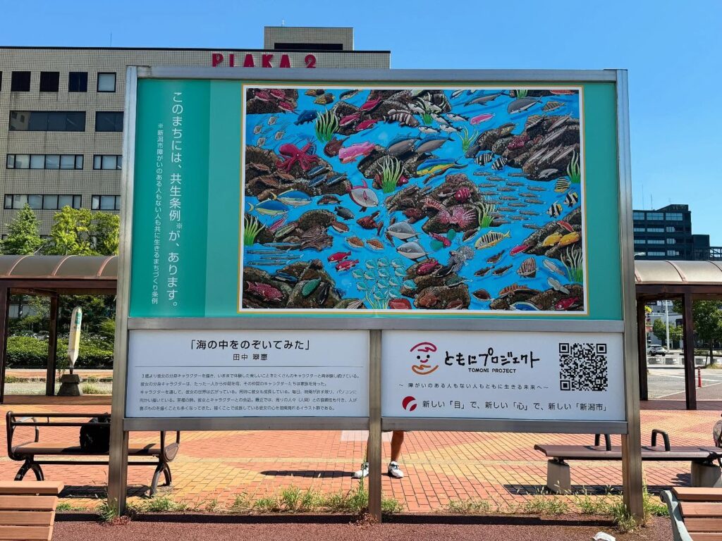 このたび、「新潟駅南口バスターミナル」および「いくとぴあ こども創造センター前」において、共生社会を象徴するサインとして、「まちごと美術館」の作品が展示されました。